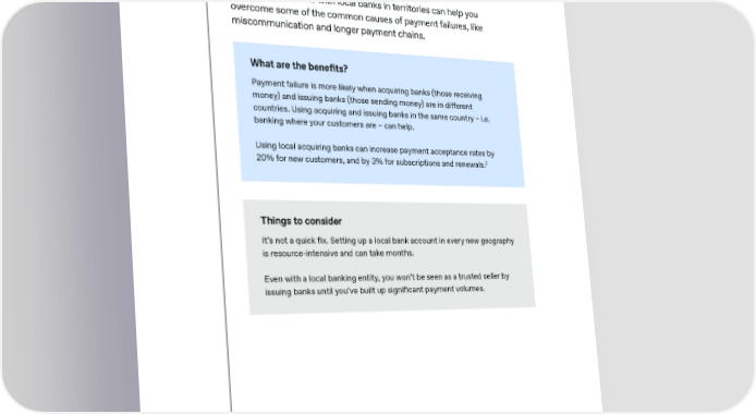 Selling SaaS Globally paddle.com 2 Local banks Setting up accounts with local banks in territories can help you overcome some of the common causes of payment failures, like miscommunication and longer payment chains. What are the bene昀椀ts? Payment failure is more likely when acquiring banks (those receiving money) and issuing banks (those sending money) are in di昀昀erent countries. Using acquiring and issuing banks in the same country – i.e. banking where your customers are – can help. Using local acquiring banks can increase payment acceptance rates by 2 20% for new customers, and by 3% for subscriptions and renewals. Things to consider It’s not a quick 昀椀x. Setting up a local bank account in every new geography is resource-intensive and can take months. Even with a local banking entity, you won’t be seen as a trusted seller by issuing banks until you’ve built up signi昀椀cant payment volumes. 11
