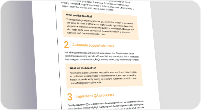 Selling SaaS Globally paddle.com How to solve the problem 1 Establish a support ethos A support ethos establishes where, when, and how your business will deploy support in each new geography. Some use a ‘follow the sun’ methodology, o昀昀ering consistent support from teams in di昀昀erent timezones. Others employ a support team that works a shift pattern out of their HQ. What are the bene昀椀ts? Thinking strategically about whether you provide live support or automated self-serve, 24 hours or o昀케ce hours, by phone or by digital channels can help you provide maximum coverage and customer satisfaction. This approach also keeps costs lower, as you avoid the need to hire out of hours and weekend sta昀昀 that work for higher rates. 2 Automate support channels Not all support requests will require human intervention. Simpler issues can be tackled by empowering users to self-serve their way to a solution. This is achieved by improving your documentation, FAQs and help center, or by implementing chatbots. What are the bene昀椀ts? Automating support channels reduces the volume of tickets being created, as customers are empowered to help themselves. It also helps you deploy budget more e昀케ciently, freeing up expensive human resource to focus on more strategically valuable work. 3 Implement QA processes Quality Assurance (QA) is the process of reviewing customer service conversations in order to deliver consistently high-quality support. QA can be performed by existing team members with the support of frameworks and technology, or can be a full-time role. What are the bene昀椀ts? QA ensures that the increase in tickets as you scale does not result in a decrease in response quality. It takes the burden of review away from support team leads, so they can concentrate on management rather than execution. 31