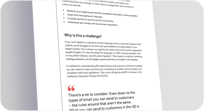 Selling SaaS Globally paddle.com Marketing communications To attract and retain customers across markets, you need to understand their specific motivations, pains, and cultural contexts, and adapt your communications accordingly. To help improve engagement and win share of voice, you should: • Research your target buyers and the competitive landscape in each geography • Adapt both messaging and language • Leverage partners to grow trust and local traction • Understand and comply with local privacy regulations Why is this a challenge? If you can’t speak to customers in their language and in a way that respects their culture, you’ll struggle to win the trust and attention of a large share of your target market. The numbers are significant: while much of the world’s population speaks English, it’s only the preferred language for 26% of people globally. One in five prefer Chinese, and 8% prefer Spanish.4 That means a localized marketing strategy presents a much bigger opportunity than an English-only strategy. In addition to understanding the expectations and nuances in different markets, you also need to make sure that your marketing and seller communications are compliant with local regulations. This covers things like GDPR in Europe or the California Consumer Privacy Act (CCPA). There’s a lot to consider. Even down to the types of email you can send to customers – the rules around that aren’t the same. What you can send to customers in the US is different from what you can send to customers in Germany.” Peter Nesbitt COO, TeamPay 24