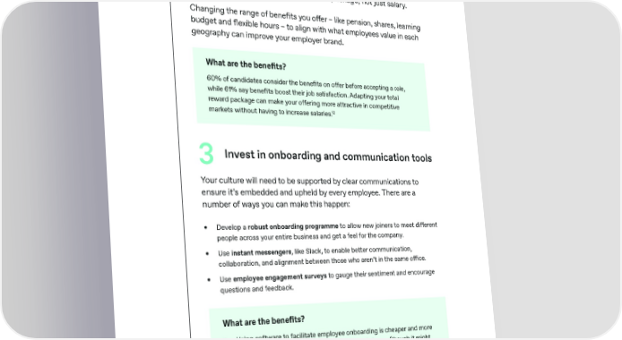 Selling SaaS Globally paddle.com 2 Adapt reward packages You should develop a compensation philosophy for your business. This should incorporate the total reward package, not just salary. Changing the range of bene昀椀ts you o昀昀er – like pension, shares, learning budget and 昀氀exible hours – to align with what employees value in each geography can improve your employer brand. What are the bene昀椀ts? 60% of candidates consider the bene昀椀ts on o昀昀er before accepting a role, while 61% say bene昀椀ts boost their job satisfaction. Adapting your total reward package can make your o昀昀ering more attractive in competitive 12 markets without having to increase salaries. 3 Invest in onboarding and communication tools Your culture will need to be supported by clear communications to ensure it’s embedded and upheld by every employee. There are a number of ways you can make this happen: • Develop a robust onboarding programme to allow new joiners to meet di昀昀erent people across your entire business and get a feel for the company. • Use instant messengers, like Slack, to enable better communication, collaboration, and alignment between those who aren’t in the same o昀케ce. • Use employee engagement surveys to gauge their sentiment and encourage questions and feedback. What are the bene昀椀ts? • Using software to facilitate employee onboarding is cheaper and more inclusive than embedding several remote People teams (though it might help to invite new joiners to HQ initially as well). • Employees may feel more comfortable sharing feedback anonymously than they would face-to-face. • Giving them the opportunity to feed back regularly enables you to track issues as they arise and pre-emptively address problems that may lead to attrition. 38