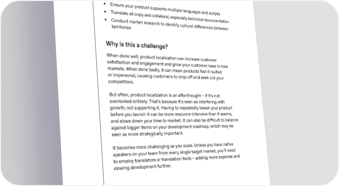 Selling SaaS Globally paddle.com Product localization Light-touch changes can help you meet with different customer expectations in different markets, and increase engagement with your product. You need to: • Ensure your product supports multiple languages and scripts • Translate all copy and collateral, especially technical documentation • Conduct market research to identify cultural di昀昀erences between territories Why is this a challenge? When done well, product localization can increase customer satisfaction and engagement and grow your customer base in new markets. When done badly, it can mean products feel ill-suited or impersonal, causing customers to drop o昀昀 and seek out your competitors. But often, product localization is an afterthought – if it’s not overlooked entirely. That’s because it’s seen as interfering with growth, not supporting it. Having to repeatedly tweak your product before you launch it can be more resource-intensive than it seems, and slows down your time to market. It can also be di昀케cult to balance against bigger items on your development roadmap, which may be seen as more strategically important. It becomes more challenging as you scale. Unless you have native speakers on your team from every single target market, you’ll need to employ translators or translation tools – adding more expense and slowing development further. 28