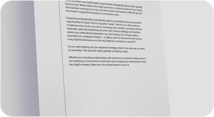 Selling SaaS Globally paddle.com The SaaS market is changing. Giant funding rounds and record breaking valuations are going to be harder to come by. And even when you do secure cash in the bank – the pressure is on to make sure you use it wisely. Now more than ever, SaaS leaders need to think strategically about which growth levers to pull. Where before this might have been a decision based on how rapidly the business could grow, it’s now one that needs to be based on e昀케cient growth that doesn’t expose the business to unnecessary risks. Expanding internationally undoubtedly opens up potential revenue and growth opportunities for SaaS. And it’s arguably “easier” than it is for other business models because, by its very nature, accessing new markets is possible without dedicated sales and marketing resources. But without strategy and intention behind your international expansion, you risk missing out on huge revenue potential from untapped markets – or falling victim to the barriers that trip too many SaaS businesses up on the way (sales tax compliance, anyone?). As you start building out your expansion strategy, there’s only one rule you need to remember: The secret to selling globally is thinking locally. Whether you’re building relationships with partners or customers, being aware of and adapting to local nuances is the best way to expand your international reach. As a SaaS company, there are a few critical areas to focus on. 5