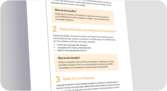 Selling SaaS Globally paddle.com How to solve the problem 1 Research your target market in detail There’s more to culture than language. Conducting market research can help you understand the cultural nuances which might impact your product strategy in each geography, like tone of voice or color palette. What are the bene昀椀ts? Ideally, good localization will feel like an original and unique experience – not something that’s been translated or adapted. This avoids alienating your target audiences. 2 Display information according to local conventions Software localization ensures your product can support each market’s required functionality and user interface conventions. It includes support for di昀昀erent date and time displays, currencies, and scripts, especially: • Double-byte languages (like Japanese) • Languages with complex scripts (like Hindi) • Right-to-left languages (like Hebrew) What are the bene昀椀ts? Software localization improves the user experience, making your product accessible and easy to use for as many potential customers as possible. This enables you to expand your customer base in new markets. 3 Speak the local language Language localization involves enlisting translators or software to create localized in- app and UX copy, and onboarding collateral. Work with translators to ensure all product copy is optimized for both users and search engines in each geography you enter. What are the bene昀椀ts? 75% of customers prefer to make buying decisions in their native 14 language. Working with native speakers either as translator or during QA rather than relying solely on translation software avoids awkward phrasing, and helps smooth out the customer experience. 29