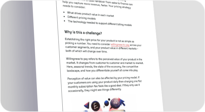 Selling SaaS Globally paddle.com Pricing Thinking strategically about pricing models and putting processes in place to ease handover from sales to finance can help you capture more revenue, faster. Your pricing strategy needs to consider: • What drives product value in each market • Di昀昀erent pricing models • The technology needed to support di昀昀erent billing models Why is this a challenge? Establishing the right price for your product is not as simple as picking a number. You need to consider willingness to pay across your customer segments, and your product value in di昀昀erent markets – both of which will change over time. Willingness to pay refers to the perceived value of your product in the market. It changes from customer to customer and market-to-market. Here, seasonal trends, the state of the economy, the competitive landscape, and how you di昀昀erentiate yourself all come into play. Perception of value can also be a昀昀ected by your pricing model. If your customers are using your product daily then charging one 昀氀at monthly subscription fee feels like a good deal. If they only use it occasionally, they might see things di昀昀erently. 19