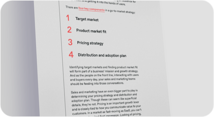 Selling SaaS Globally paddle.com Even the best product in the world won’t take o昀昀 if it’s not supported by a robust go-to-market strategy. Your sales and marketing teams are responsible for building an audience for your product and getting it into the hands of users. There are four key components in a go-to-market strategy: 1 Target market 2 Product market 昀椀t 3 Pricing strategy 4 Distribution and adoption plan Identifying target markets and 昀椀nding product market 昀椀t will form part of a business’ mission and growth strategy. And as the people on the front line, interacting with users and buyers every day, your sales and marketing teams should be feeding into those conversations. Sales and marketing have an even bigger part to play in determining your pricing strategy and distribution and adoption plan. Though these can seem like super昀椀cial details, they’re not. Pricing is an important growth lever and is closely tied to how you communicate value to your customers. In a market as fast-moving as SaaS, you can’t a昀昀ord to make a bad 昀椀rst impression. Looking at pricing, checkout, and communications will help you put your best foot forward. 18